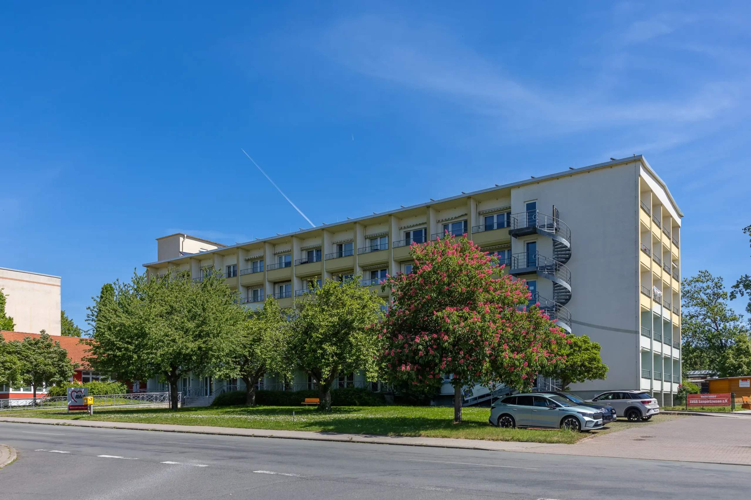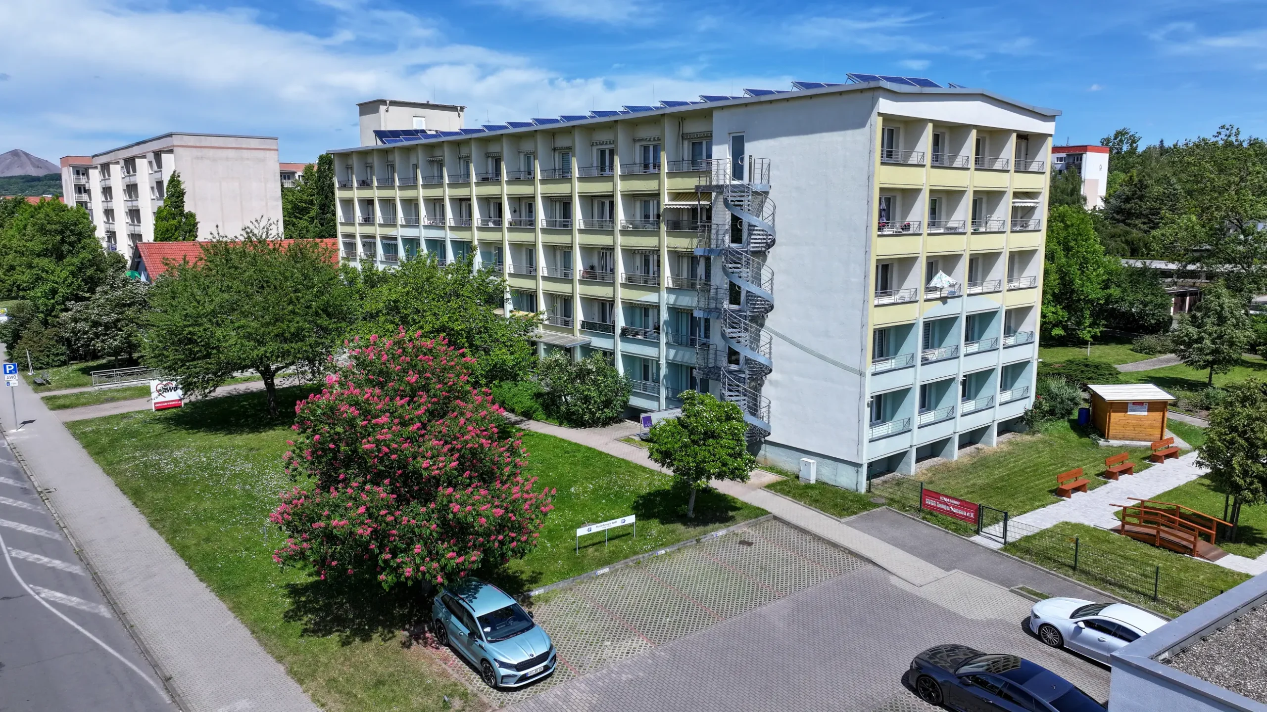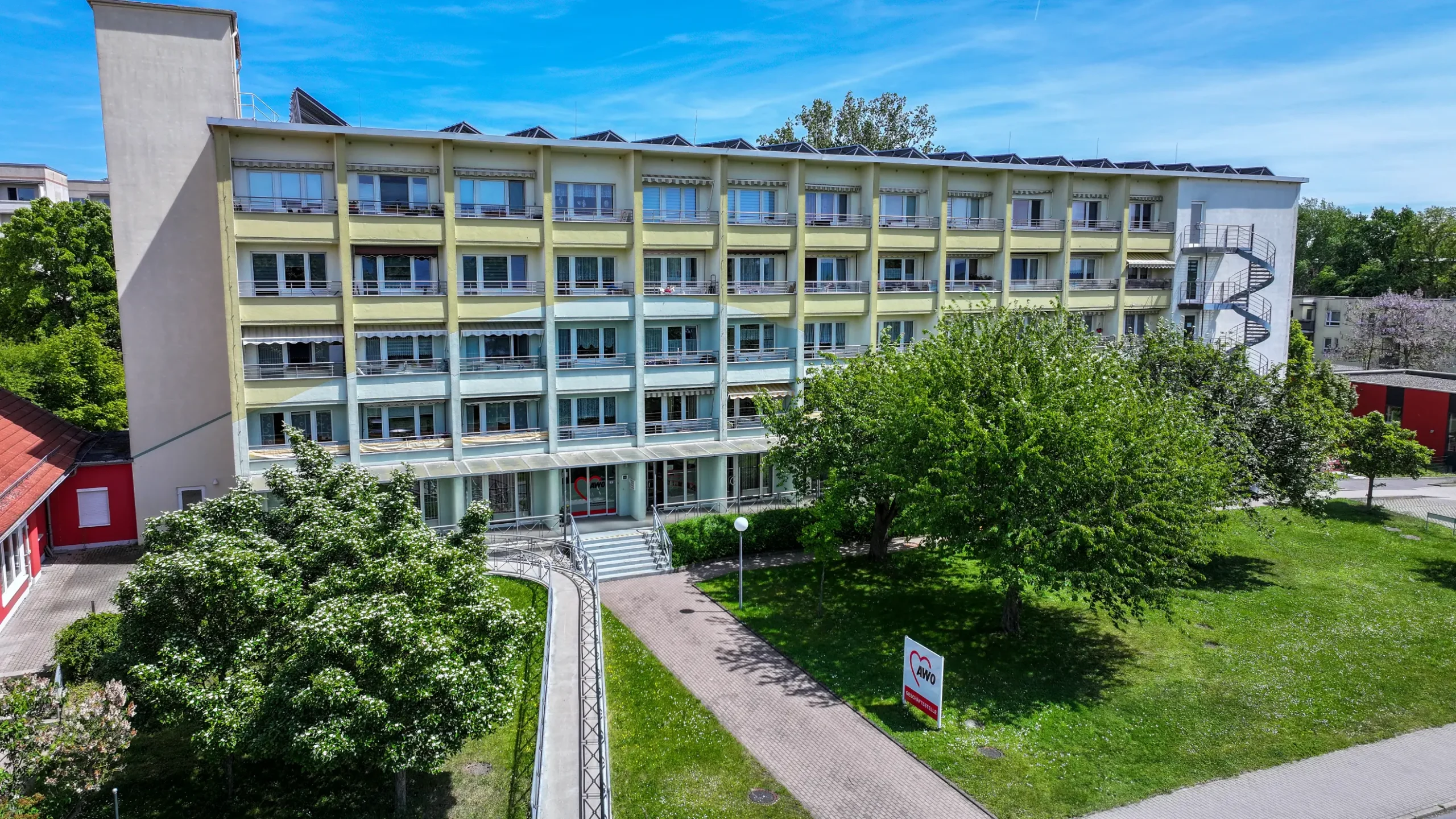 Als Besonderheit ist noch zu erwähnen, dass sich im Erdgeschoss des Wohnkomplexes eine Physiotherapiepraxis, ein Friseur und eine Kosmetik/Fußpflege befinden. Ebenso sind die Geschäftsräume unseres AWO Kreisverbandes hier, u. a. mit Geschäftsleitung, Beratungsstellen und einer Kleiderkammer, ansässig. In einem Anbau des Gebäudes ist ein Gastrobetrieb etabliert, bei dem verschiedenste Gerichte zur Mitnahme gekauft oder auch vor Ort verzehrt werden können.